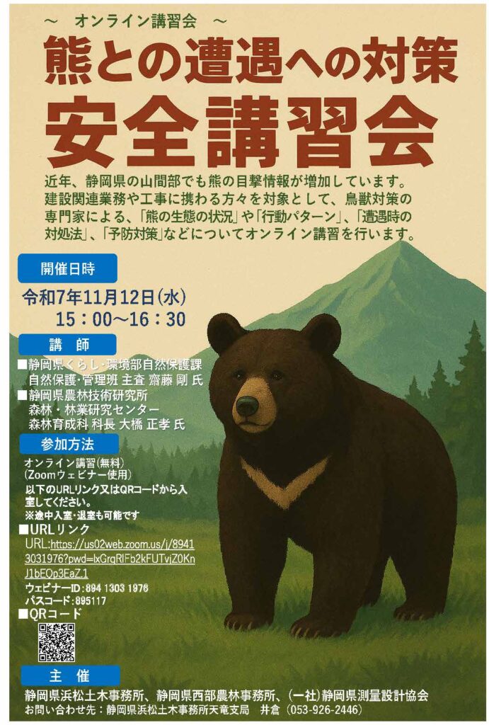 【静岡県浜松土木事務所他】「熊との遭遇への対策」安全講習会(Zoomによるオンライン無料講習)の開催について(11月12日(水)15時~16時半)