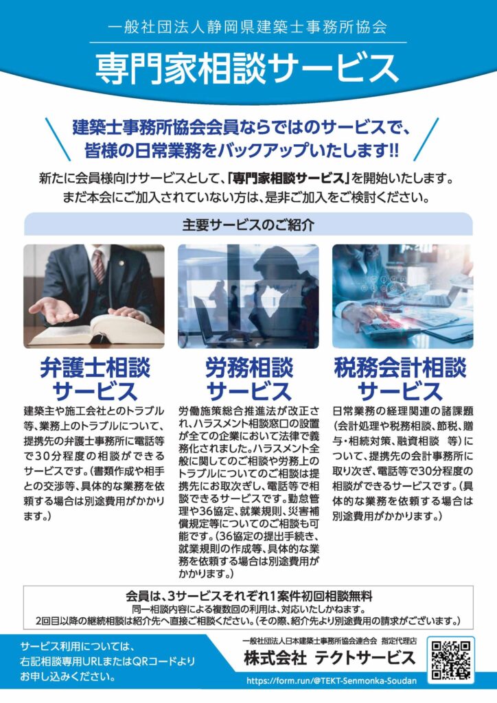 静岡県建築士事務所協会では新たに正会員向けサービスとして弁護士、労務、財務会計の無料相談サービスを開始しました。